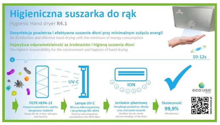 - Higieniczna suszarka kieszeniowa R1.1 EcoUse — prędkość do 617 km/h, czas suszenia ok. 10 s, HEPA13, opcjonalna jonizacja NAI, powłoka IONPURE, długa gwarancja