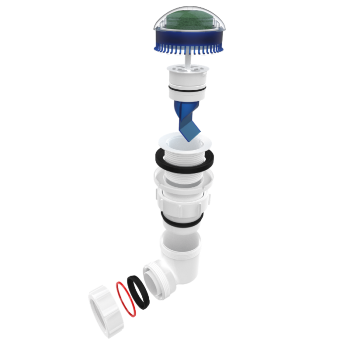 - Separator zanieczyszczeń — wyłapuje włosy, gumę do żucia i ręczniki papierowe, zanim dotrą do kanalizacji i spowodują większy problem.