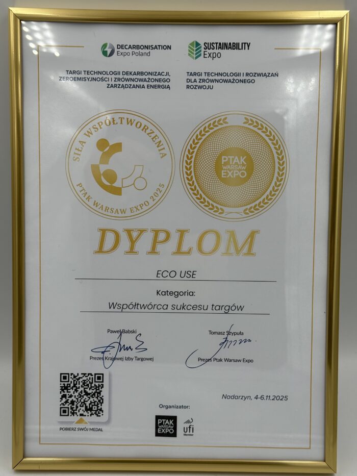 W dniach 4-6 listopada 2025 roku Ptak Warsaw Expo w Nadarzynie stało się centrum innowacji i zrównoważonego rozwoju dzięki debiutanckiej edycji targów Sustainability Expo oraz Decarbonisation Expo Poland. Wydarzenie to zgromadziło liderów branży, ekspertów oraz entuzjastów ekologicznych technologii, oferując platformę do wymiany wiedzy i doświadczeń w zakresie zrównoważonego rozwoju. EcoUse miało zaszczyt być partnerem tego wyjątkowego wydarzenia, co zostało uhonorowane dyplomem Współtworzenia sukcesu targów.